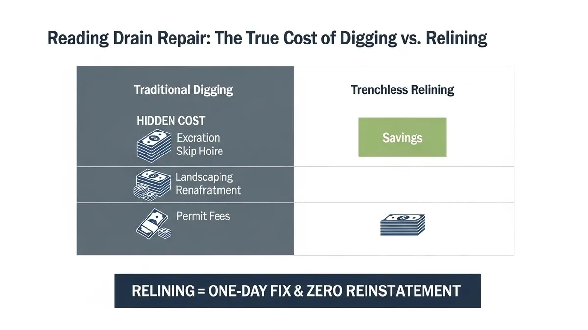 If you wait until the pipe collapses, the cost jumps from a standard £600–£1,200 relining job to a full-scale excavation that can easily exceed £3,000-£5,000, especially if we have to navigate utility lines or reinstate expensive landscaping near Beaconsfield.